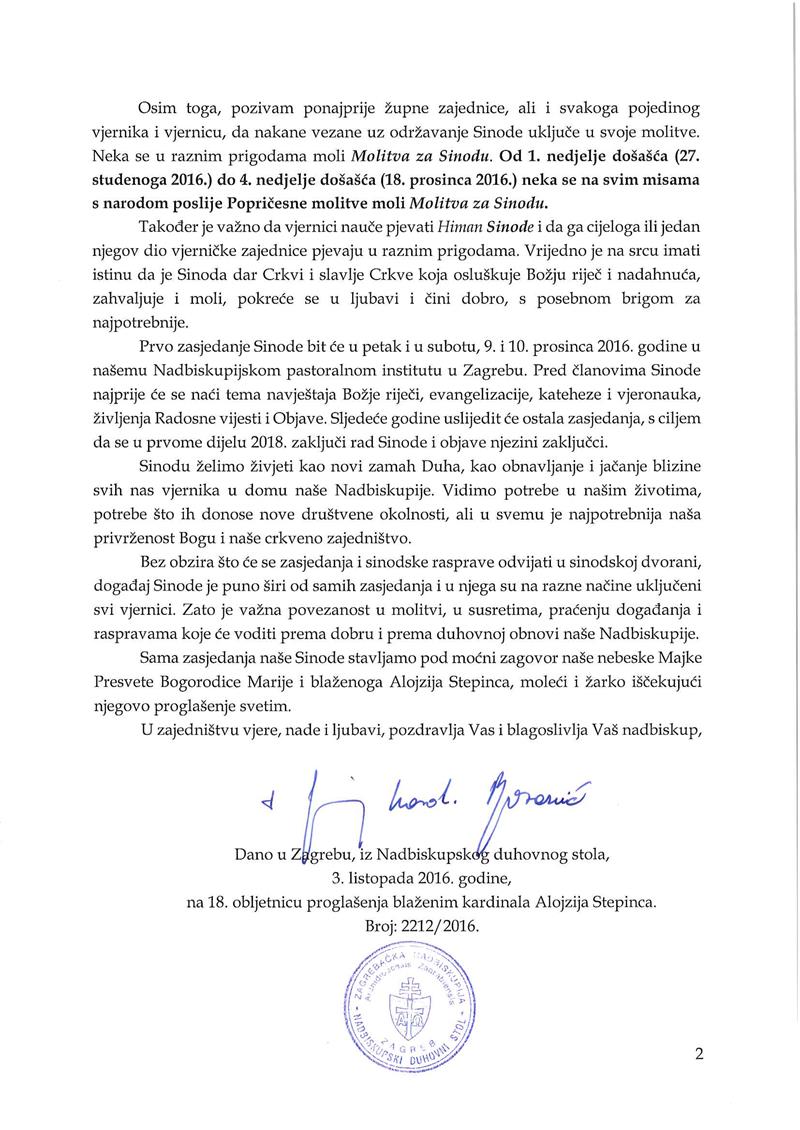 U pismu je Kardinal pozvao ponajprije župne zajednice, ali i svakoga pojedinog vjernika i vjernicu, da nakane vezane uz održavanje Sinode uključe u svoje molitve, te da se u raznim prigodama moli Molitva za Sinodu. Prvo zasjedanje Sinode, nastavlja Kardinal u svom pismu, bit će u petak i u subotu, 9. i 10. prosinca 2016. godine u našemu Nadbiskupijskom pastoralnom institutu u Zagrebu. Pred članovima Sinode najprije će se naći tema navještaja Božje riječi, evangelizacije, kateheze i vjeronauka, življenja Radosne vijesti i Objave.