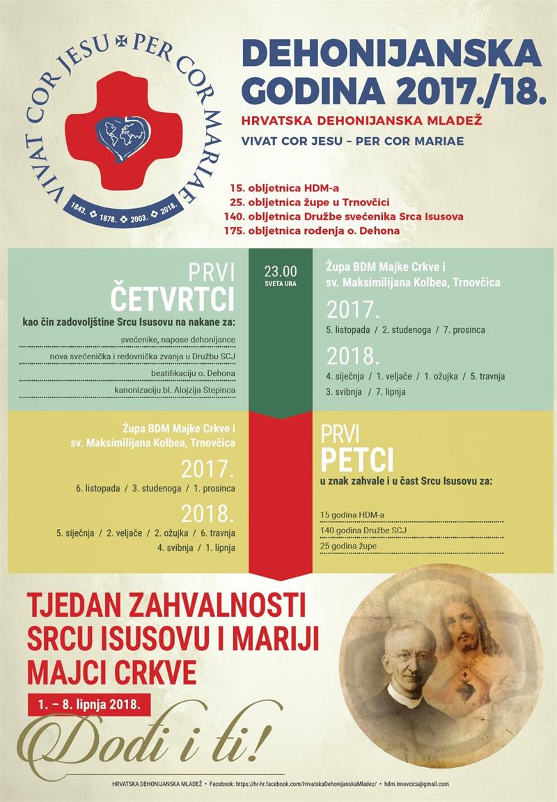Povod ovoj godini su: 175. obljetnica rođenja o. Dehona (1843.), 140. obljetnica Družbe dehonijanca (1878.), 15. obljetnica Hrvatske dehonijanske mladeži (2003.) te 25. obljetnica župe u Trnovčici (1993.), a koje će se proslaviti u lipnju 2018.