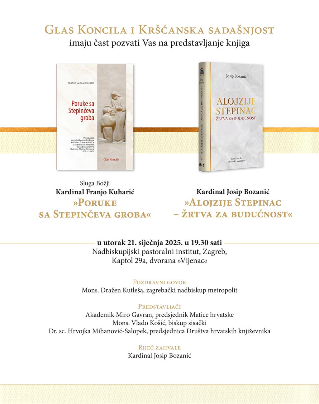 Predstavljanje knjiga kardinala Franje Kuharića "Poruke sa Stepinčeva groba" i kardinala Josipa Bozanića "Alojzije Stepinac - žrtva za budućnost" održat će se u utorak 21. siječnja u 19.30 u dvorani "Vijenac" Nadbiskupijskog pastoralnog instituta (Kaptol 29).