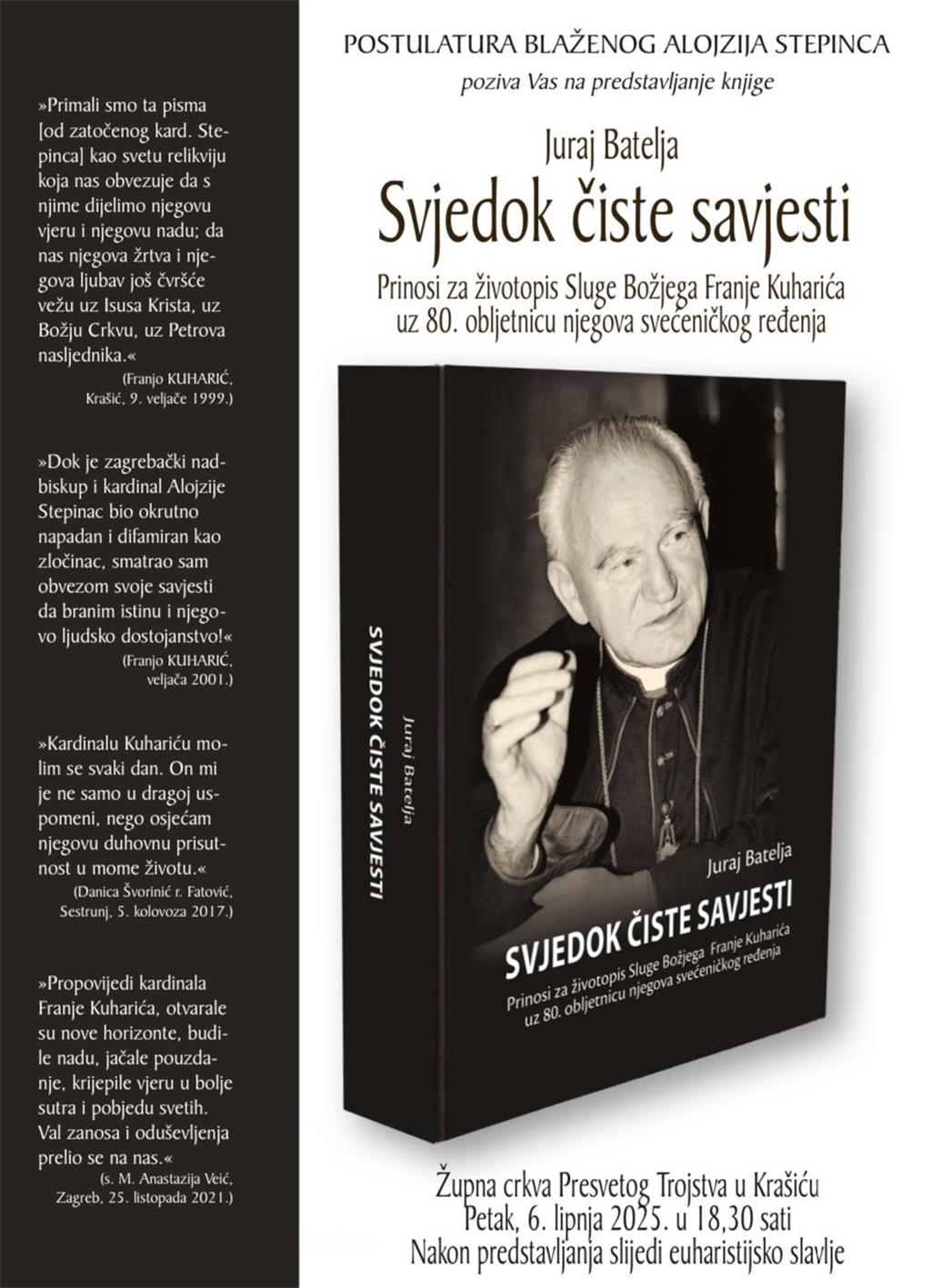 U župnoj crkvi Presvetoga Trojstva u Krašiću mons. Juraj Batelja, postulator kauze za proglašenje svetim bl. Alojzija Stepinca, predstavit će knjigu "Svjedok čiste savjesti - prinosi za životopis Sluge Božjega Franje Kuharića uz 80. obljetnicu njegova svećeničkog ređenja" u petak 6. lipnja.