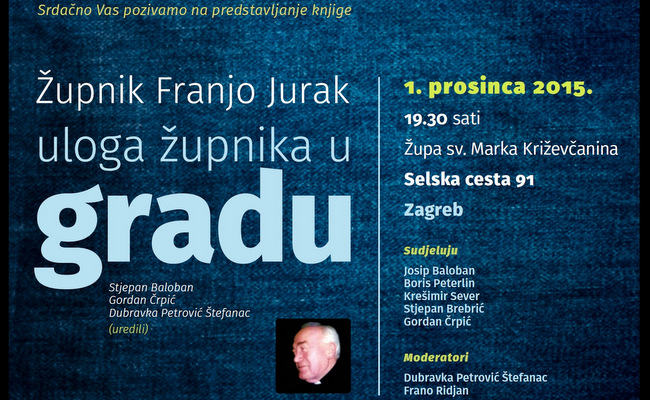 U utorak, 1. prosinca 2015. s početkom u 19.30 sati, u Župi sv. Marka Križevčanina, Zagreb, Selska cesta 91, bit će predstavljena knjiga: Župnik Franjo Jurak - uloga župnika u gradu.