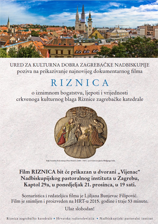 Dokumentarni film „Riznica", o iznimnom bogatstvu te ljepoti i vrijednosti crkvenoga kulturnoga blaga Riznice zagrebačke katedrale, predstavit će se u dvorani „Vijenac" Nadbiskupijskog pastoralnog instituta u Zagrebu, Kaptol 29a, u ponedjeljak 21. prosinca, u 19 sati, u organizaciji Ureda za kulturna dobra Zagrebačke nadbiskupije.