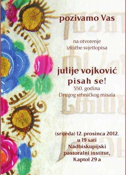 Nadbiskupijski pastoralni institut u Zagrebu i Društvo prijatelja glagoljice u sklopu projekta Hrvatska glagoljaška baština priređuju izložbu „Pisah se“ posvećenu 550. obljetnici Drugog vrbničkog misala. Svečano otvorenje izložbe održat će se u srijedu, 12. prosinca 2012. godine u 19 sati u prostoru Nadbiskupijskog pastoralnog instituta, Zagreb, Kaptol 29a. Autorica izložbe je Julija Vojković, dizajnerica i grafička urednica. Izložba će u Institutu biti postavljena do 31. siječnja 2013. godine.