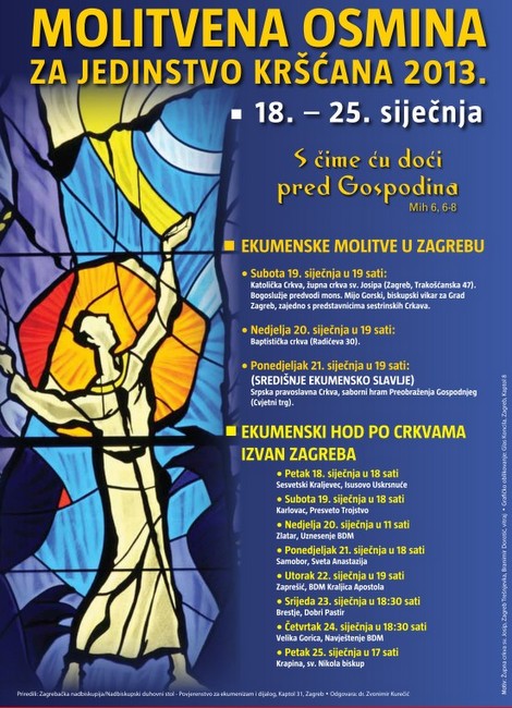 Molitvena osmina za jedinstvo kršćana u Zagrebu i Zagrebačkoj nadbiskupiji održat će se od 18. do 25. siječnja pod geslom "S čime ću doći pred Gospodina" (Mih 6, 6-8).