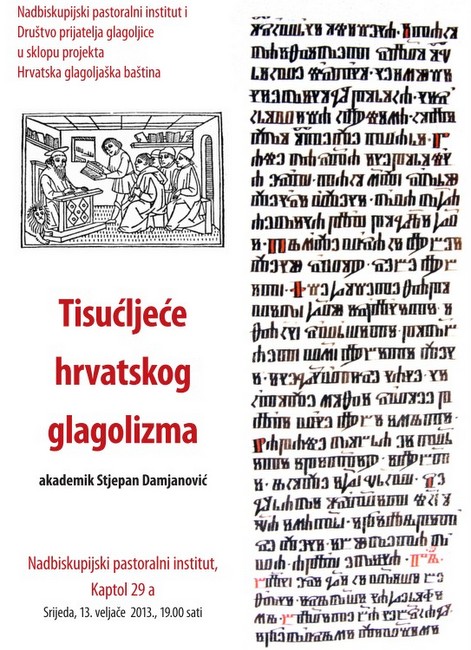 Nadbiskupijski pastoralni institut u Zagrebu i Društvo prijatelja glagoljice u sklopu projekta Hrvatska glagoljaška baština priređuju u srijedu, 13. veljače 2013. s početkom u 19 sati u dvorani Vijenac, Kaptol 29a, tribinu pod nazivom Tisućljeće hrvatskog glagolizma. O temi će govoriti akademik Stjepan Damjanović.