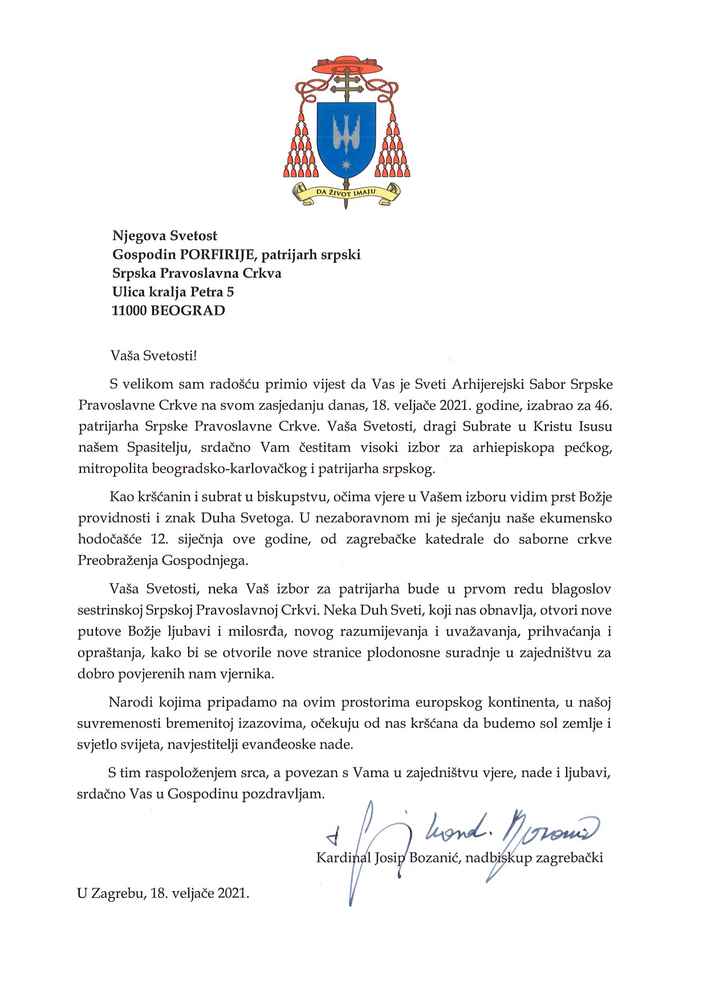 On Thursday, 18 February 2021 Metropolitan Archbishop of the Archdiocese of Zagreb, Cardinal Josip Bozanić congratulated Metropolitan Porfirije of Zagreb and Ljubljana on his election as the Patriarch of the Serbian Orthodox Church. We bring you the full text of Cardinal Bozanić’s letter of congratulations: