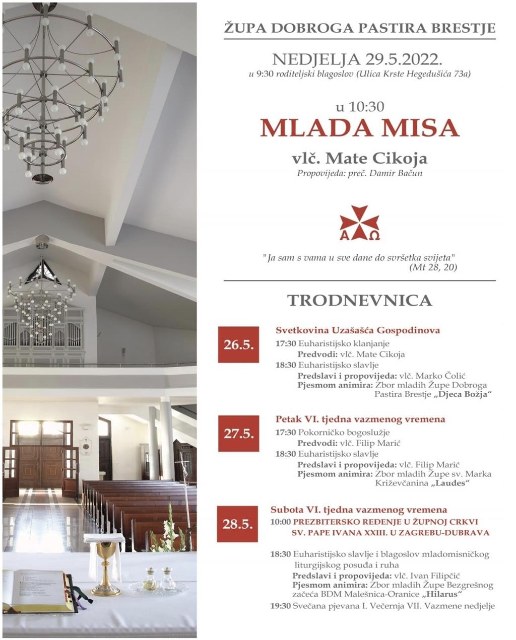 - u subotu, 28. svibnja svetu misu u 18.30 sati predvodi i propovijeda vlč. Ivan Filipčić, župnik Župe Krista Kralja, Zagreb-Trnje.