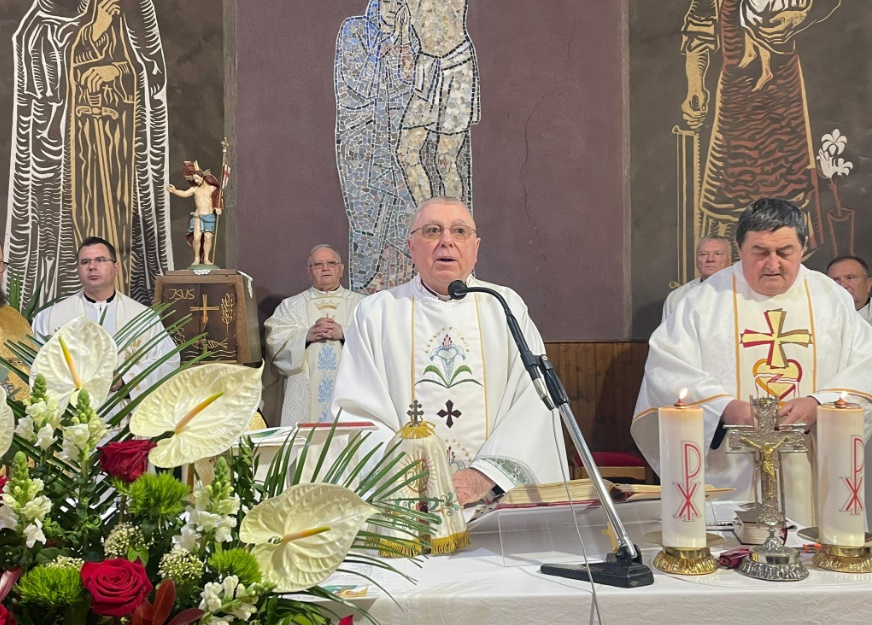 „Dragi pribićki župljani! Što su Isusovi učenici čuli i vidjeli − mi danas svjedočimo. A svjedočimo sjećajući se 15. travnja 1919. godine kad je je župi Pribić rođeno i sutradan kršteno 13. dijete u obitelji Ivana Kuharića i Ane r. Blažić. Riječ je o kršćaninu na kojem je vidljivo bila položena desnica Gospodnja (Ps 118, 16) jer je istine katoličke vjere natprosječno živio i umro na glasu svetosti”, rekao je u homiliji mons. Batelja.