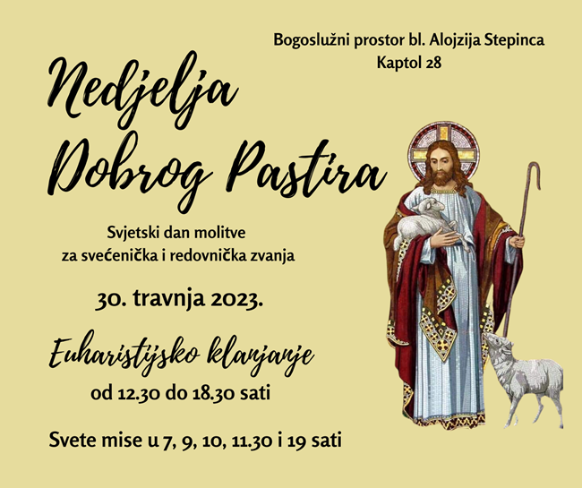 U Bogoslužnom prostoru bl. Alojzija Stepinca na Nedjelju Dobrog Pastira, 30. travnja, bit će euharistijsko klanjanje od 12.30 do 18.30 sati.