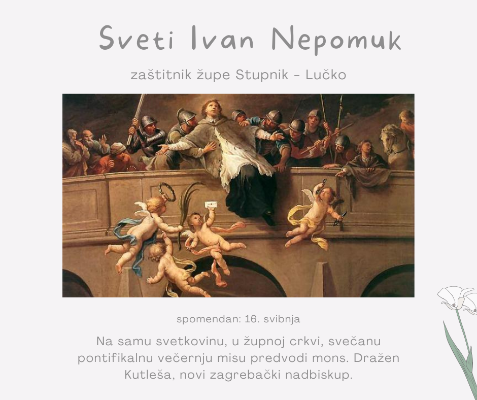 Župljani Župe svetog Ivana Nepomuka, Stupnik - Lučko, u utorak 16. svibnja slave svoj župni blagdan. Svečano misno slavlje u 19 sati proslave blagdana sv. Ivana Nepomuka predslavit će mons. Dražen Kutleša, novi zagrebački nadbiskup, u zajedništvu sa svećenicima Svetonedeljskog dekanata. Jutarnje mise slavit će se u 7.30 i 9.30 sati.