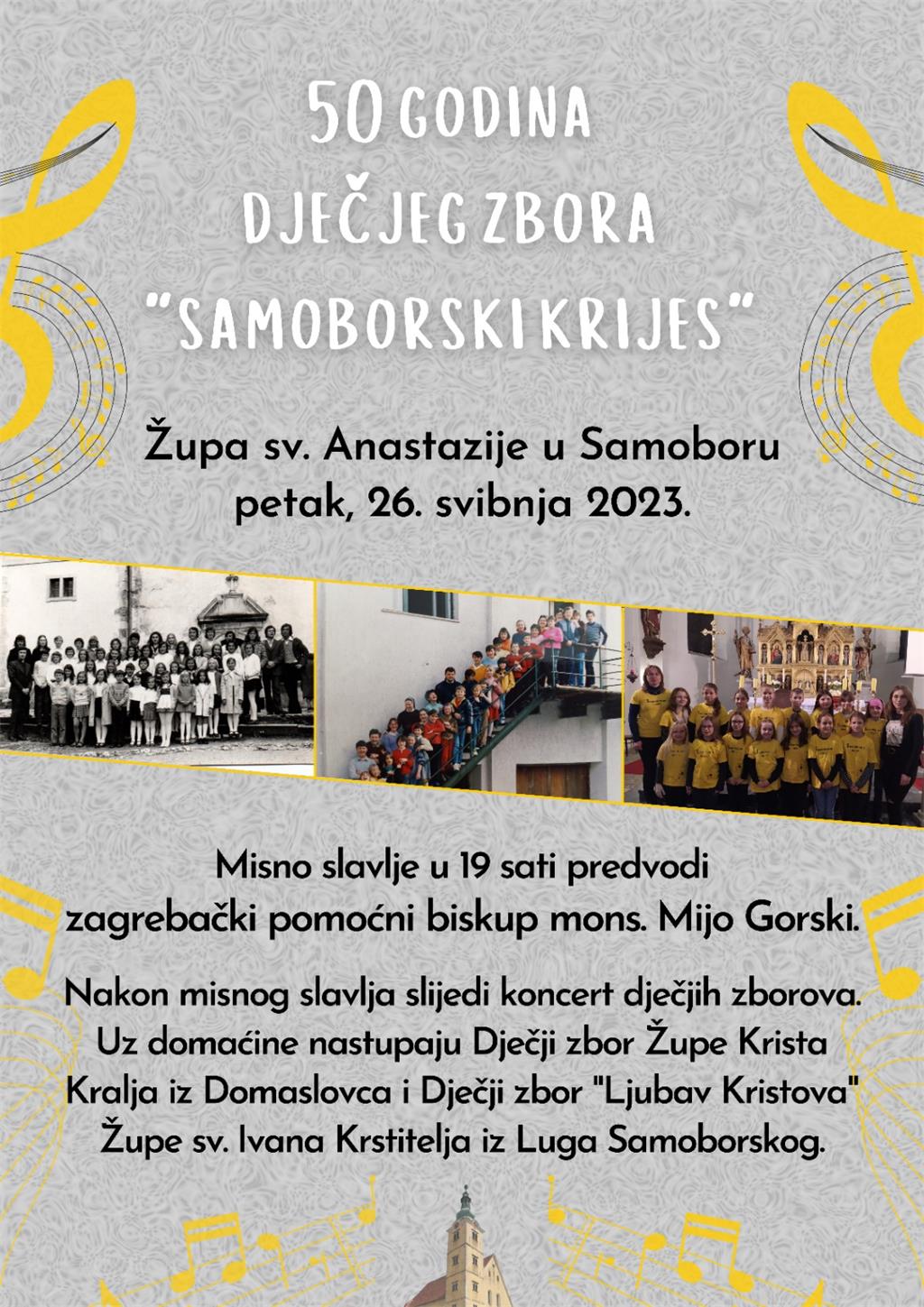 Dječji zbor koji djeluje u samoborskoj župi sv. Anastazije, „Samoborski krijes“, ove godine proslavlja svoj zlatni jubilej. Pedeset godina rada, pjevanja i sviranja Gospodinu, znak su žive Crkve i djelovanja Duha Svetoga po onima koji mu se otvore. Stoga će petak uoči svetkovine Pedesetnice, 26. svibnja, „Samoborski krijes“ svečano proslaviti svoj zlatni jubilej. Euharistijsko slavlje u 19.00 sati u župnoj crkvi sv. Anastazije predslavit će pomoćni zagrebački biskup mons. Mijo Gorski, nakon čega će biti prigodni koncert.