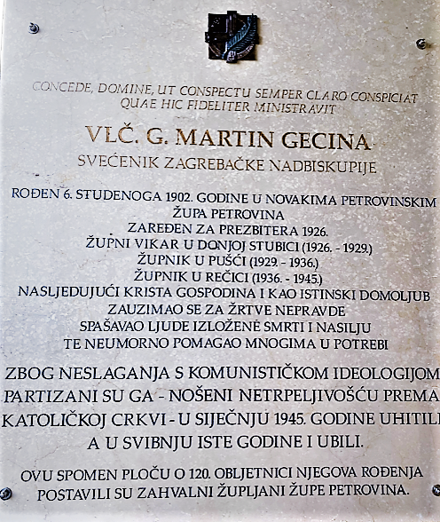 Spomen-ploču podigli su zahvalni župljani Župe sv. Petra u Petrovini, u znak zahvale i sjećanja na župljanina vlč. Martina Gecinu.