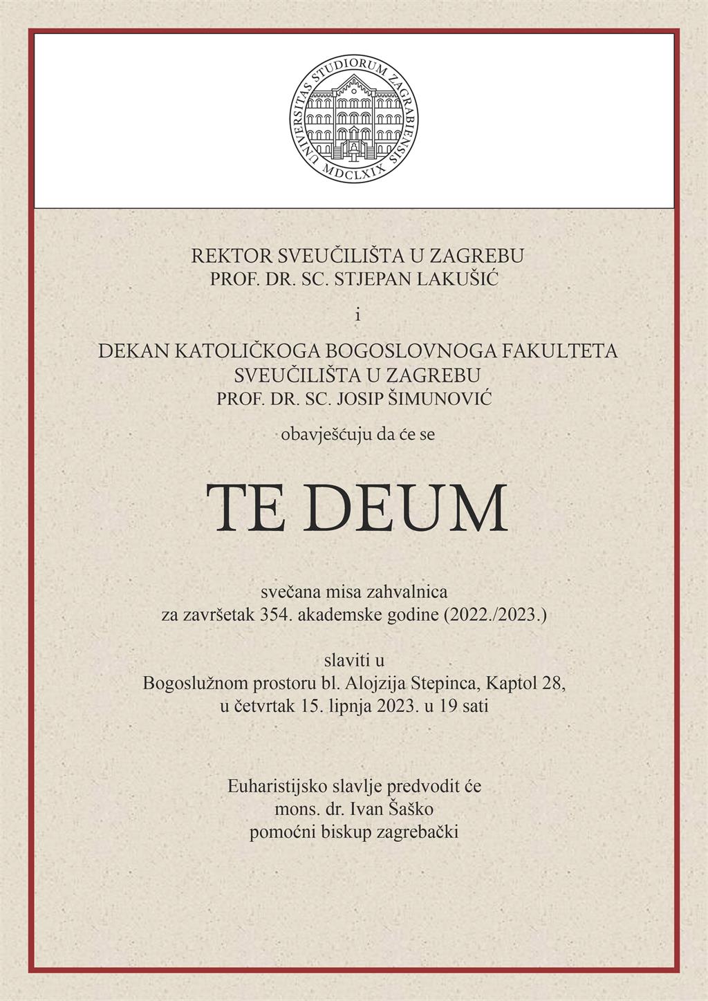 U četvrtak, 15. lipnja 2023. godine, u Bogoslužnom prostoru bl. Alojzija Stepinca, Kaptol 28, Zagreb s početkom u 19 sati mons. dr. Ivan Šaško, pomoćni biskup zagrebački, predslavit će svečani „Te Deum laudamus“ - misu zahvalnicu svih fakulteta i akademija Sveučilišta u Zagrebu za akademsku godinu 2022./2023.