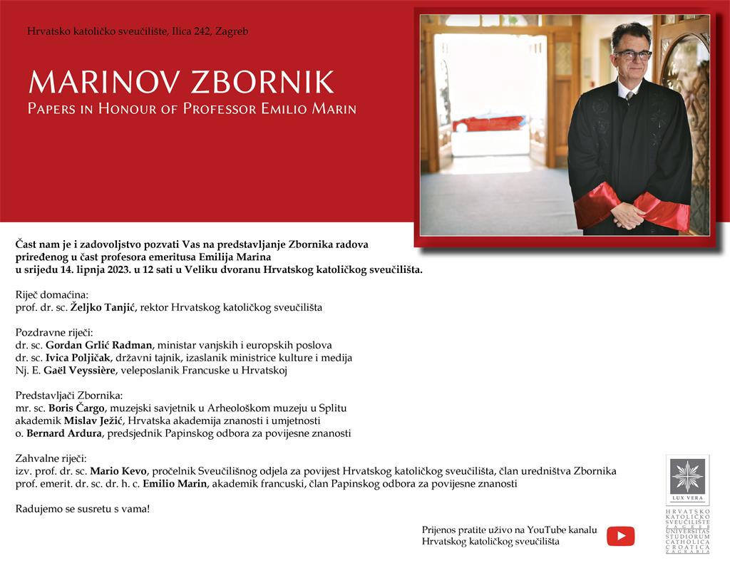 U srijedu 14. lipnja 2023. u 12 sati u Velikoj dvorani Hrvatskog katoličkog sveučilišta bit će predstavljen „Marinov zbornik“, zbornik radova priređen u čast 70. rođendana prvog profesora emeritusa Hrvatskog katoličkog sveučilišta prof. emerit. dr. sc. dr. h. c. Emilija Marina.