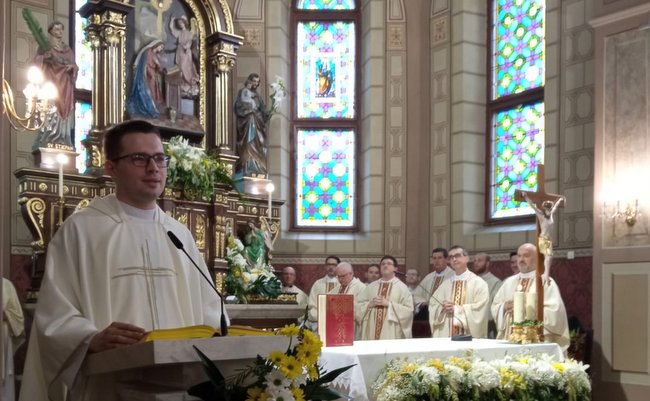 Božju je riječ na euharistijskom slavlju protumačio vlč. Dario Kral, vicekancelar pri Nadbiskupskom duhovnom stolu Zagrebačke nadbiskupije. Govorio je o pozivu, Isusovom pozivu upućenom Mateju cariniku, Mateju mladomisniku i svima nama. Tmačeći navješteno evanđelje propovjednik je istaknuo da ono svima okupljenima kako svećenicima tako i vjernicima daje priliku osvijestiti činjenicu poziva i okupljanja na misnom slavlju da bi svako 'evo me' razgorilo i zasjalo novim sjajem. "U Evanđelju, znakovito je to, nailazimo na poziv upućen Mateju. I njemu je Božji poziv stigao nenadano, neočekivano i ničim uvjetovano. Mi tog Mateja danas poznajemo kao svetog, kao apostola, kao onog čije stranice Evanđelja čitamo ne bismo li i sami pronašli volju Božju za svoj život, ne bi li i mi osjetili Božju blizinu i milost. Međutim, u trenutku kad je na njega pao Kristov pogled i do njegovih ušiju dopro glas, Matej nije bio ni svet, ni apostol, ni evanđelist nego carinik. Poziv je zatekao neočekivanu osobu – carinika, u neočekivano vrijeme – dok je sjedio u carinarnici. Biti carinik u ono vrijeme značilo je imati novac i otprilike samo to, jer je to zvanje u židovskom narodu donosilo prijezir budući da je podrazumijevalo suradnju s rimskim okupatorom. Biti carinik u svim vremenima znači sjediti u svom malom svijetu izvjesnosti i komfora u kojem vodimo kalkulacije sa životom vodeći se jednadžbom što mi se isplati, a što ne. Biti carinik znači voditi se računicom što od života mogu zgrabiti za sebe, a da istovremeno od sebe dajem što manje. I, ako smo ikad mislili da poziv dolazi samo snažnim i vrlim ljudima, onda poziv upućen Mateju razbija svaku našu iluziju o tome i ukazuje: Božji poziv svakoga zatiče upravo dok sjedi u svojoj osobnoj carinarnici vlastite ograničenosti, slabosti i nedostojnosti. Ali, ako odgovori na glas Kristova poziva, mijenja se sve. Na glas tog poziva Matej ustaje i kreće. Pogledajmo taj kontrast – moment prije sjedio je, a to je slika obamrlosti, a sad, dajući odgovor vjere, Matej ustaje i kreće, dobiva život, dobiva polet jer život je uvijek put, hod, nasljedovanje. Sjediti znači umirati, krenuti za Kristom znači živjeti."