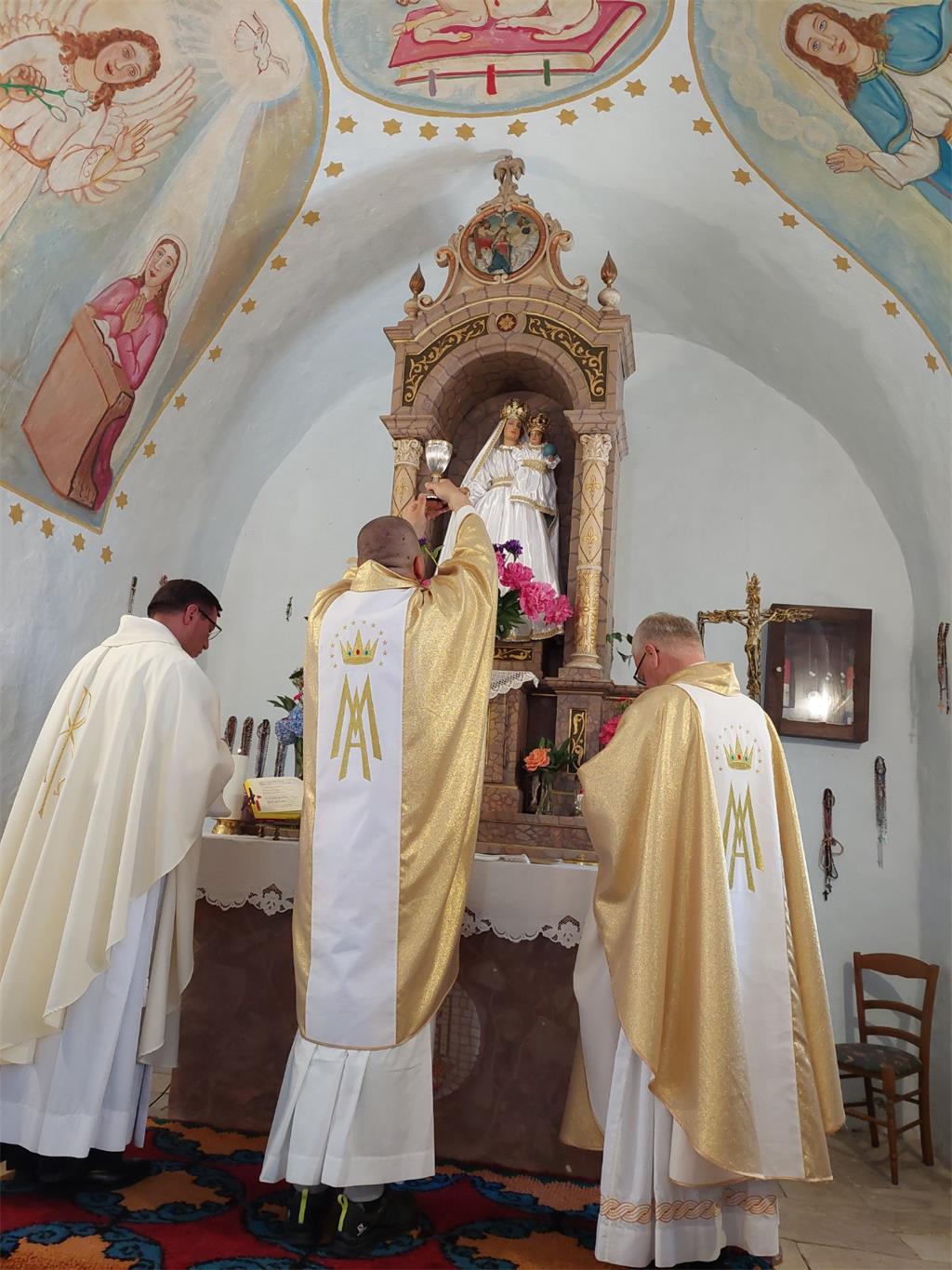 Hodočasnici su stigli u Krasno tijekom prijepodneva te slavili svetu misu koju je predvodio župni vikar u Samoboru vlč. Marko Nimac u zajedništu s domaćim župnikom vlč. Stjepanom Zebom i župnikom u Solinu vlč. Antom Čotićem, koji je također s tamošnjim dječjim zborom hodočastio u to Svetište.