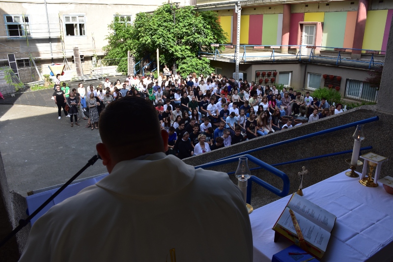 Pozdravljajući učenike i druge sudionike slavlja preč. Pavlaković kazao je kako „ovaj naš „skelama optočen“ ulaz u školu koji sada postaje naša „crkva na otvorenom“ ovoga jutra odiše posebnom radošću jer se u njoj okuplja gimnazijska obitelj i kako na početku – zazivajući Božju pomoć i milost – tako osobito sada, na završetku školske i vjeronaučne godine, okuplja se u zahvalnosti za primljene darove u kojima smo prepoznavali Božju blizinu, počevši od dragih nam ljudi, ljepote susreta i suradnje, preko usvojenih znanja, do darovanoga vremena i prijeđenoga puta na kojemu Bogu zahvaljujemo, ali želimo reći hvala i za kušnje koje su naš snašle, za teške trenutke života“, ustvrdio je predvoditelj slavlja i podsjetio okupljene da „danas Crkva pred nas stavlja svetački primjer Alojzija Gonzage, redovnika Družbe Isusove. Zbog ustrajnosti oko očuvanja čistoće i želje da se sav posveti Bogu te zbog mladosti u kojoj je dosegnuo savršenstvo nasljedovanja Krista, katolička ga je mladež uzela za svoga zaštitnika. Njemu danas preporučimo sve svoje nakane s kojima smo ušli na ovo slavlje.“