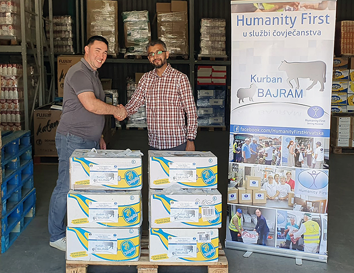 »Moto udruge Humanity First Hrvatska je 'služiti čovječanstvu'. U tom smislu uvijek tražimo nove načine i sredstva kako bismo pomogli ljudima u potrebi. Zato koristimo priliku Kurban-bajrama, koji je vrlo blagoslovljeno vrijeme u islamu, kada je naglasak na pomaganju i iskazivanju suosjećanja prema drugima. Tijekom ovih blagoslovljenih dana svaki musliman, koji ima sredstva, žrtvuje životinju kako bi podijelio meso među svojom obitelji, prijateljima i potrebitim osobama. Svrha toga je usmjeriti pažnju prema slabima u našem društvu i omogućiti im da sudjeluju u slavlju. Na taj način ljubav se dijeli, a sreća se pokazuje na ulicama i u srcima ljudi. Mi kao Humanity First jako smo zahvalni donatorima koji nam omogućuju distribuciju mesa među potrebnima s istom namjerom dijeljenja ljubavi i suosjećanja, a s druge strane smanjenje boli i briga ljudi pogođenih problemima. Ne pravimo razliku da li se donacija daje muslimanu ili nemuslimanu. Ono što gledamo su okolnosti ljudi. Ako nekome treba pomoć tu smo da ga uhvatimo za ruku i pružimo pomoć. Na isti način kao što u blagoslovljene dane Božića dijelimo pakete hrane potrebnima. Vrijeme je da se kao čovječanstvo okupimo i čujemo vapaj potrebitih. To je jedini način da se postigne mir za sve. Svima koji slave Kurban-bajram želimo sretan i blagoslovljen Kurban-bajram - Bajram šerif mubarak olsun«, izjavio je predsjednik udruge Humanity First Hrvatska gosp. Khan Munawwar prigodom uručenja donacije u Caritasovom skladištu u Rakitju 30. lipnja ove godine.