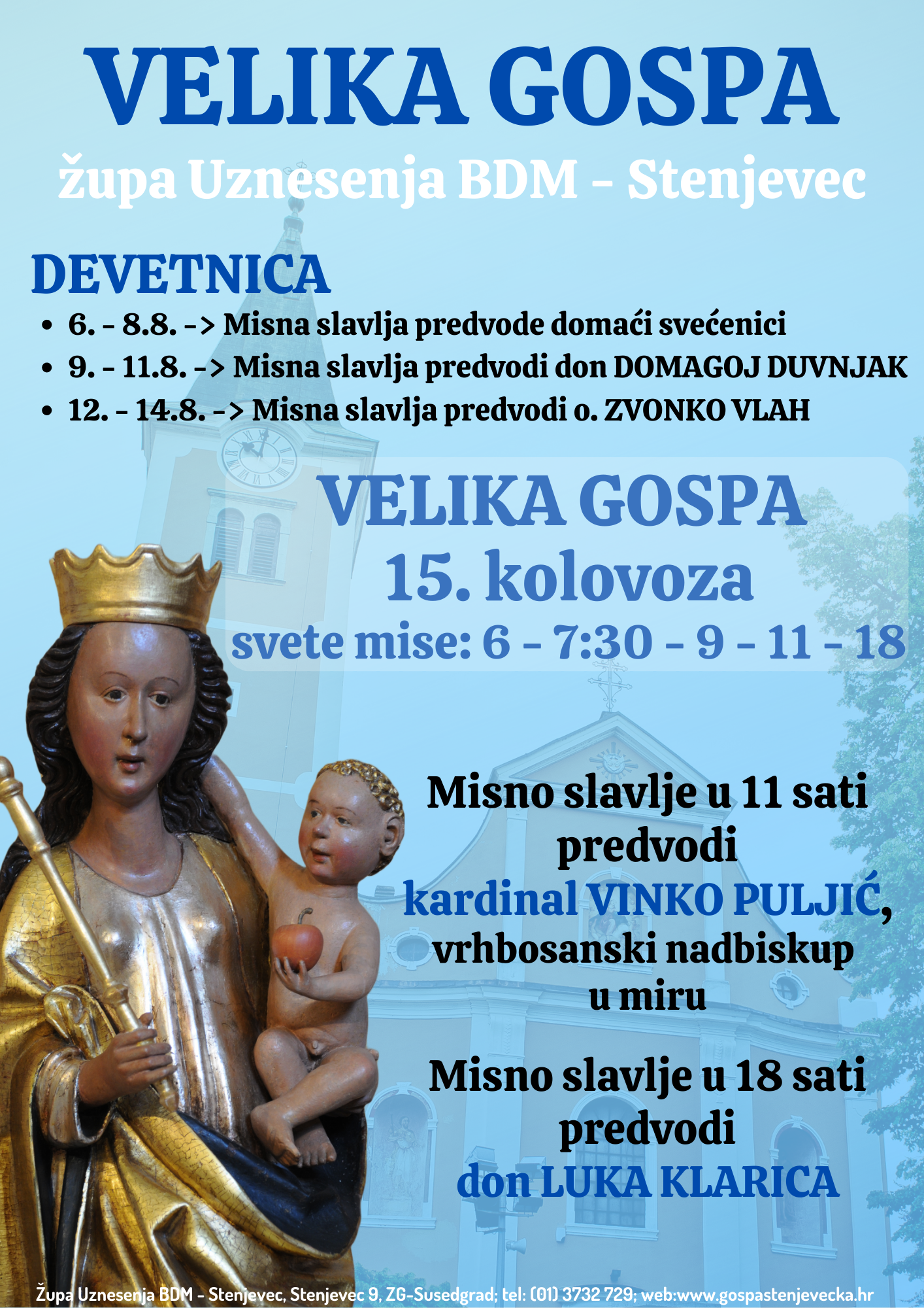 Središnje misno slavlje proslave Velike Gospe u Župi Uznesenja BDM, Zagreb - Stenjevec u utorak, 15. kolovoza u 11 sati predlavit će vrhbosanski nadbiskup u miru kardinal Vinko Puljić. Istoga dana večernje misno slavlje u 18. sati predslavit će don Luka Klarica. Proslavi prethodit će devetodnevna priprema koju će predvoditi domaći svećenici, don Domagoj Duvnjak i o. Zvonko Vlah.