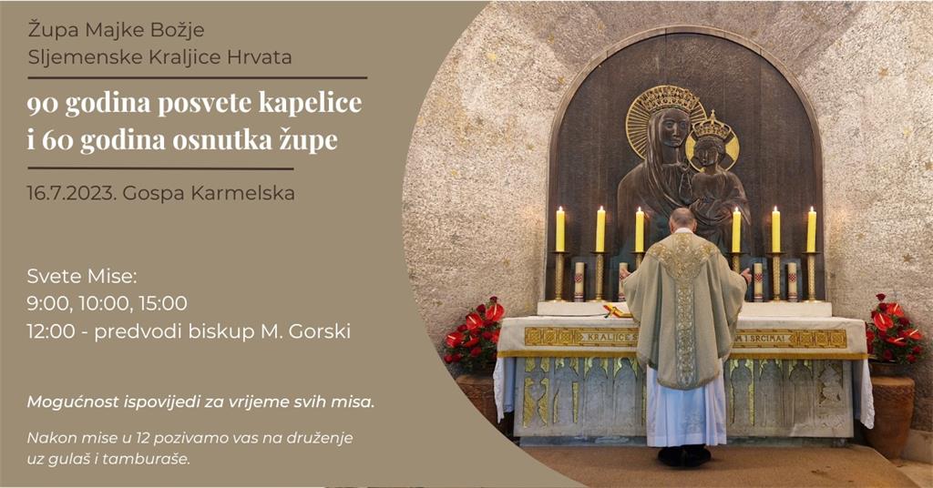 Župa Majke Božje Sljemenske Kraljice Hrvata proslavit će 90 godina posvete kapelice i 60 godina osnutka župe 16. srpnja na blagdan Gospe Karmelske. Središnju misu u 12 sati predvodit će zagrebački pomoćni biskup Mijo Gorski.