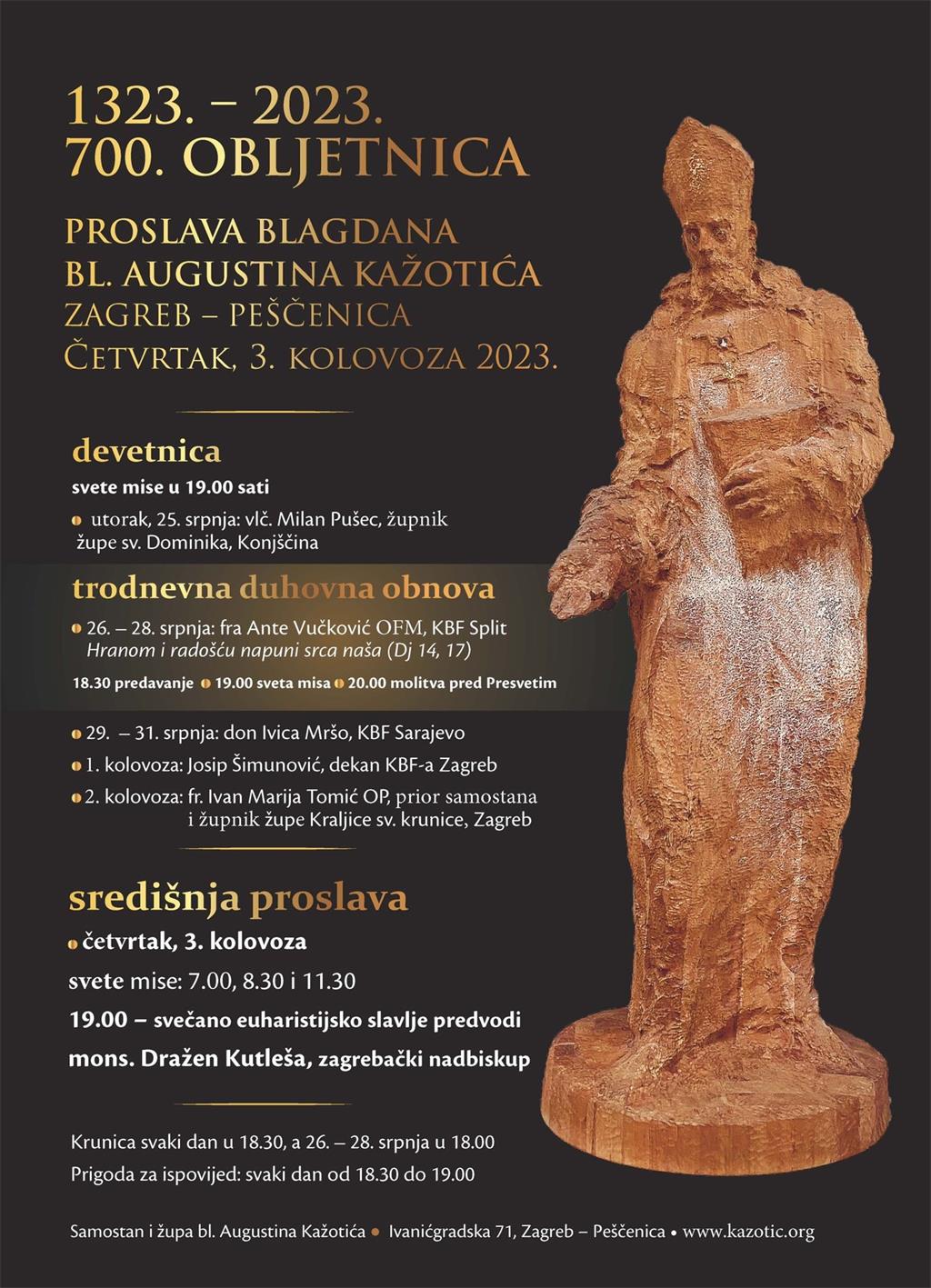 Na svetkovinu prvog hrvatskog blaženika Augustina Kažotića, 3. kolovoza, mise u župnoj crkvi bl. Augustina Kažotića u Zagrebu (Peščenica, Ivanićgradska 71) su u 7, 8:30 i 11:30. Središnje euharistijsko slavlje u 19 sati predvodi zagrebački nadbiskup Dražen Kutleša.