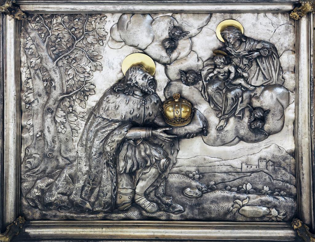 Antependij iz katedrale - Lijeva bočna ploča prikazuje ugarskog kralja svetog Stjepana s krunom u ruci.