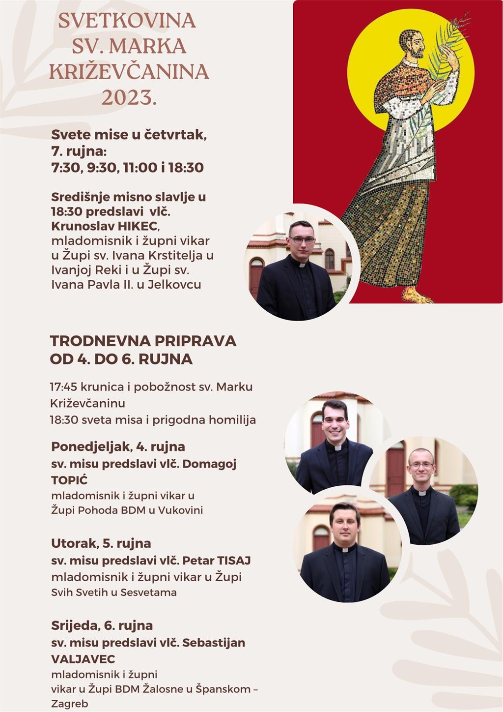 Župa sv. Marka Križevčanina 7. rujna proslavit će titular Župe. Središnje misno slavlje u 18:30 sati predslavit će vlč. Krunoslav Hikec, mladomisnik i župni vikar u Župi sv. Ivana Krstitelja u Ivanjoj Reki i u Župi sv. Ivana Pavla II. u Jelkovcu. U trodnevnoj duhovnoj pripravi misna slavlja predslavit će ovogodišnji mladomisnici Zagrebačke nadbiskupije.