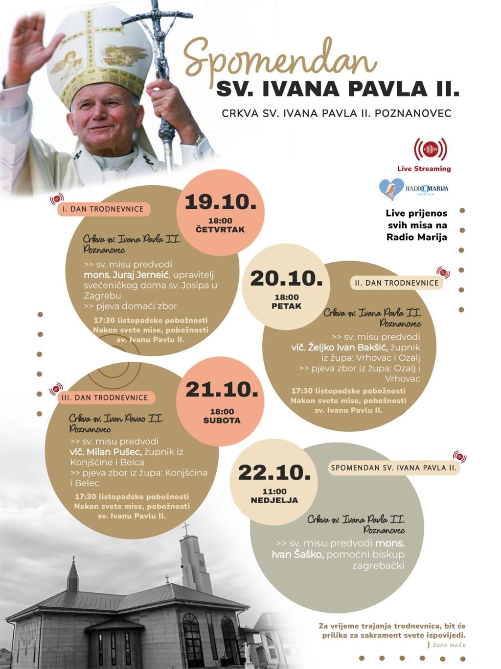 Svečanu proslavu spomendana sv. Ivana Pavla II. u Poznanovcu, u nedjelju 22. listopada u 11 sati, predslavit će pomoćni biskup zagrebački mons. Ivan Šaško.