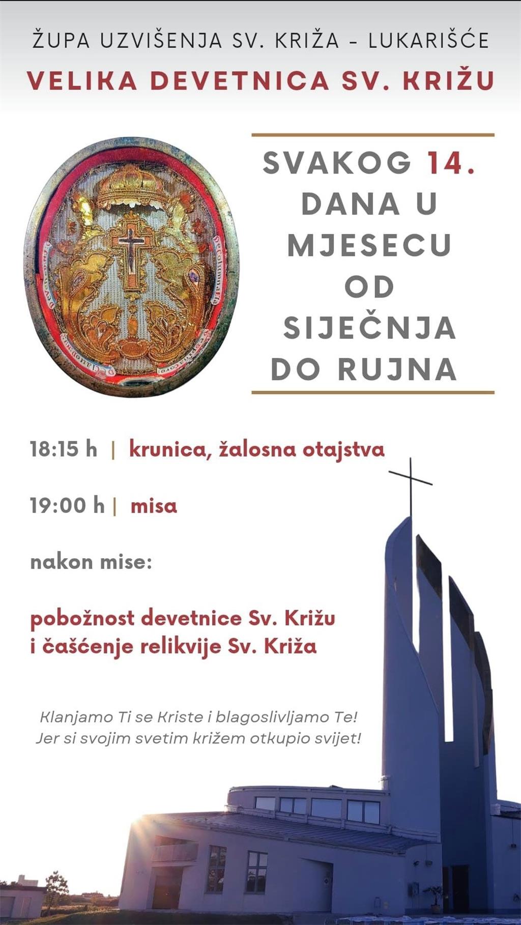 Župa Uzvišenja Svetoga Križa u Dugom Selu - Lukarišće organizira veliku devetnicu Svetom Križu svakog 14. u mjesecu od siječnja do rujna, uoči župne svetkovine.