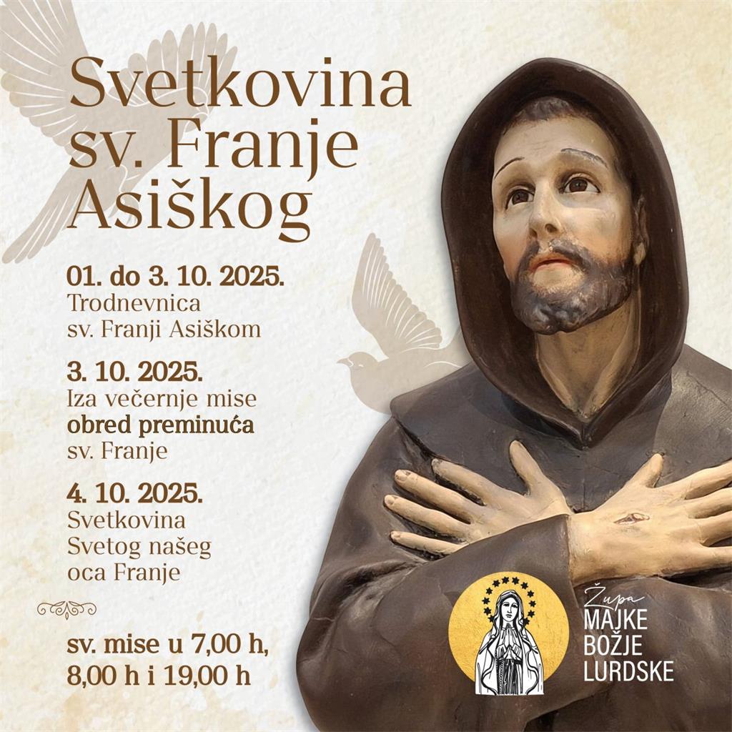 Svetkovina sv. Franje Asiškog bit će obilježena svečanim euharistijskim slavljem 4. listopada.