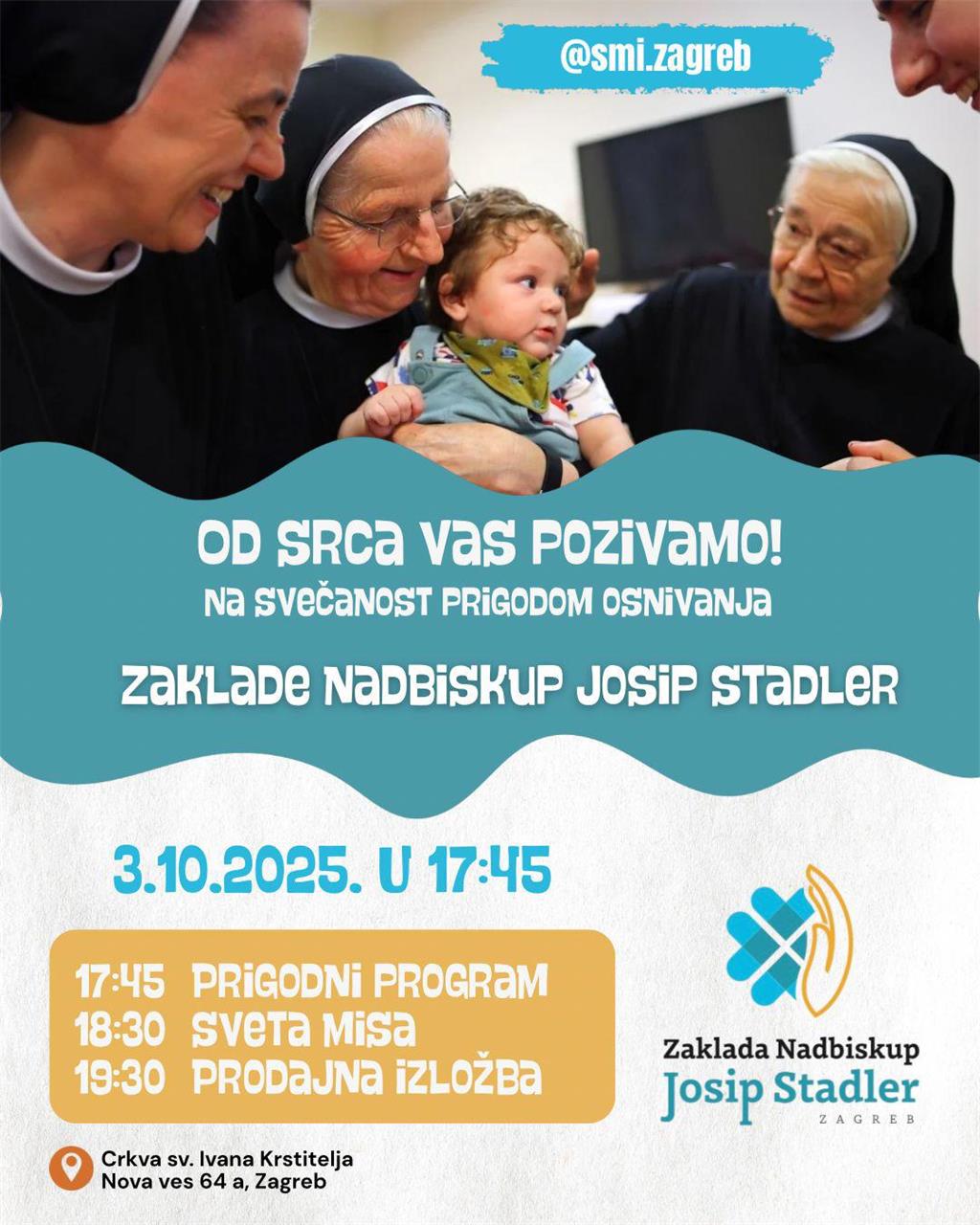 Svečanost prigodom osnivanja Zaklade Nadbiskup Josip Stadler, u organizaciji Sestara Služavki Malog Isusa zagrebačke provincije, održat će se u petak 3. listopada u župnoj crkvi sv. Ivana Krstitelja s početkom u 17.45 sati.