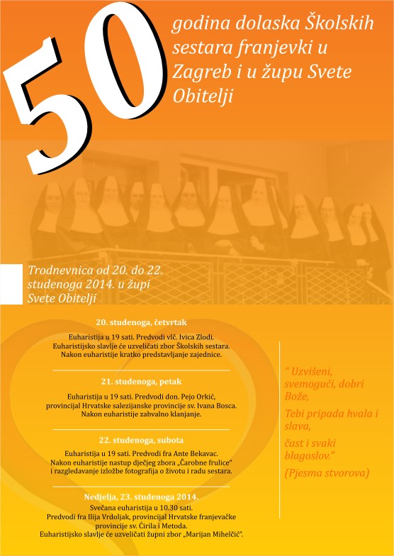 U nedjelju 23. studenoga 2014, na svetkovinu Krista Kralja, upriličit će se proslava 50. obljetnice dolaska i pastoralnog djelovanja Školskih sestara franjevki Krista Kralja Bosansko-hrvatske provincije u Zagrebu, u župi Svete Obitelji.