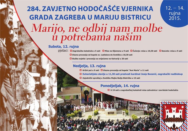 Hodočasnici pješaci, predvođeni dvojicom zagrebačkih pomoćnih biskupa, mons. Ivanom Šaškom i mons. Mijom Gorskim, u subotu 12. rujna u 5 sati organizirano kreću ispred zagrebačke katedrale na tradicionalno, 284. po redu zavjetno hodočašće vjernika grada Zagreba Majci Božjoj Bistričkoj.
