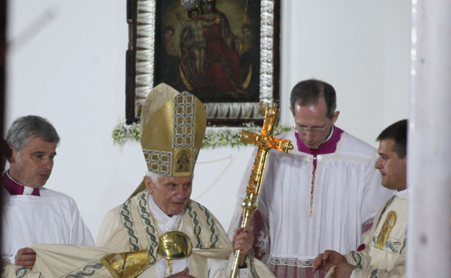 Papa Benedikt XVI. molio je pred slikom Majke Božje zajedno s 30 000 mladih na Trgu bana Jelačića u Zagrebu 4. srpnja 2011. godine. Osvrnuvši se na značenje središnjeg povijesnog zagrebačkog trga, srca grada Zagreba, mjesta susreta i komunikacije, na kojemu često prevladava žamor i svakodnevna vreva, a u tom trenutku ga je nazočnost mladih gotovo pretvorila u „hram“, čiji je svod samo nebo, papa Benedikt je pozvao mlade da se ne boje povjeriti sebe Gospodinu, kao što se to, na poseban način, razmatra „u Djevici Mariji, Majci Crkve, koja se ovdje ljubi i časti kao 'Majka Božja od Kamenitih vrata'“.