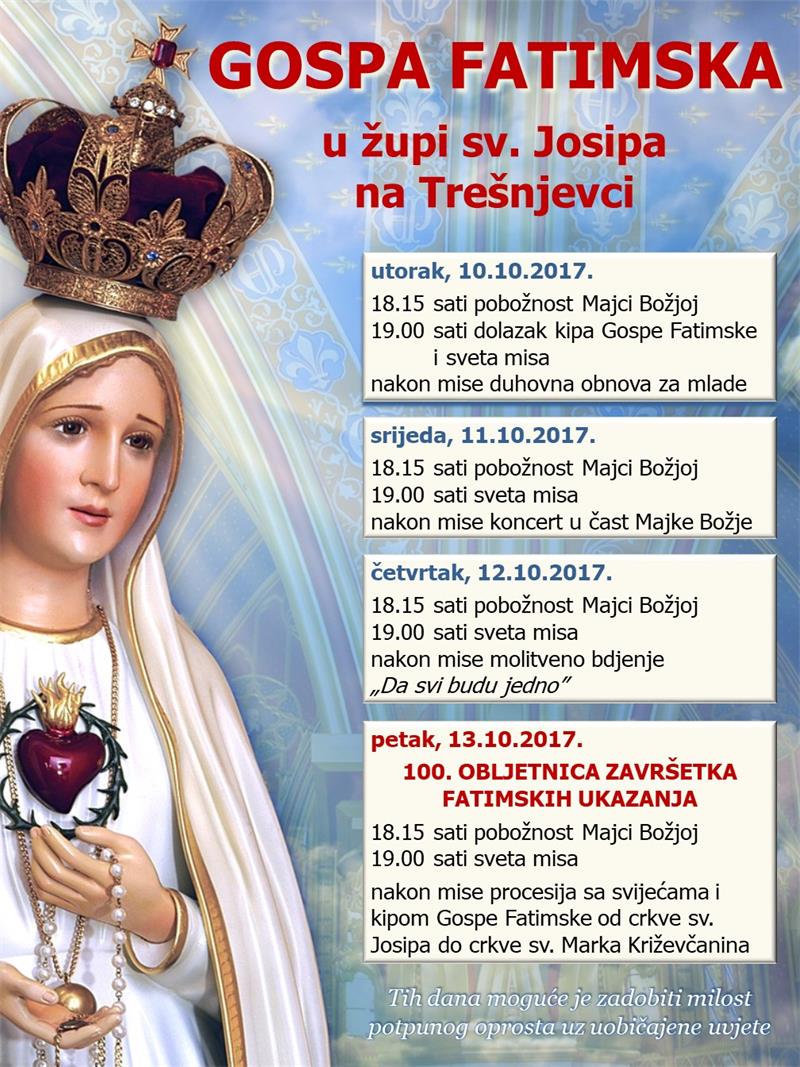 U petak, 13. listopada obljetnica je zadnjeg ukazanja Majke Božje u Fatimi kada se uz Nju ukazao i sv. Josip. Slavlje započinje marijanskom pobožnošću u 18.15 sati te svetom misom u 19 sati.