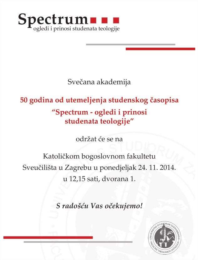 Uredništvo časopisa „Spectrum – ogledi i prinosi studenata teologije“ poziva na svečanu akademiju povodom proslave 50 godina od utemeljenja studentskoga časopisa Katoličkoga bogoslovnog fakulteta Sveučilišta u Zagrebu. Akademija će se održati na Katoličkom bogoslovnom fakultetu (Vlaška 38) u ponedjeljak 24. studenoga 2014. u 12.15 sati u dvorani 1.