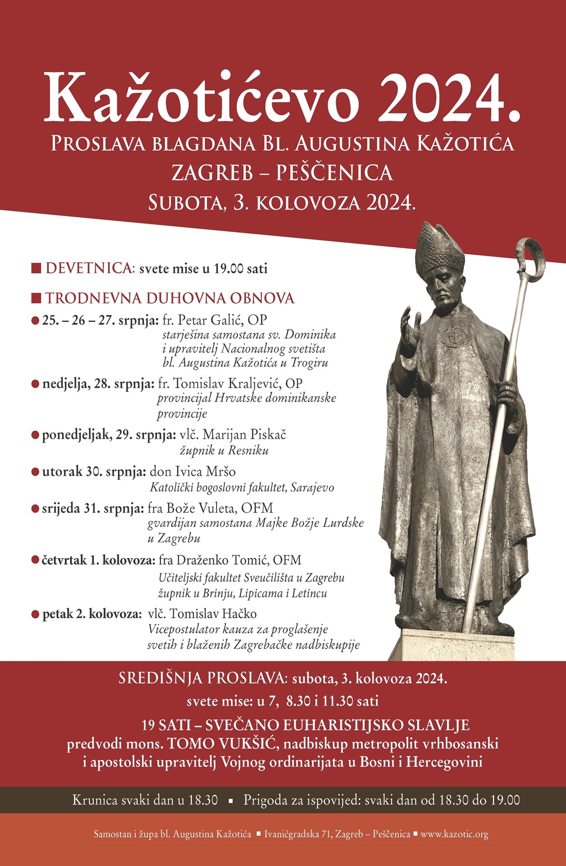 Na blagdan sv. Jakova apostola, u četvrtak 25. srpnja u Župi bl. Augustina Kažotića u Zagrebu na Peščenici (Ivanićgradska 71, na križanju s Vukovarskom) započinje devetnica za proslavu bl. Augustina Kažotića, zaštitnika župe i samostana bl. Augustina Kažotića, biskupa Zagreba i Lucere, prvoga hrvatskoga blaženika. Misna slavlja devetnice slavit će se u 19 sati.