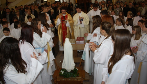 Misno slavlje svojom pjesmom uveličao je veliki mješoviti zbor „COR JESU“ pod vodstvom sestre Davide Dizdar. Svečanost je završila procesijom u crkvi s kipom Gospe Fatimske, kojeg su ponosno nosile ovogodišnje krizmanice, te posvetom krunica i molitvenika za ovogodišnje prvopričesnike.
