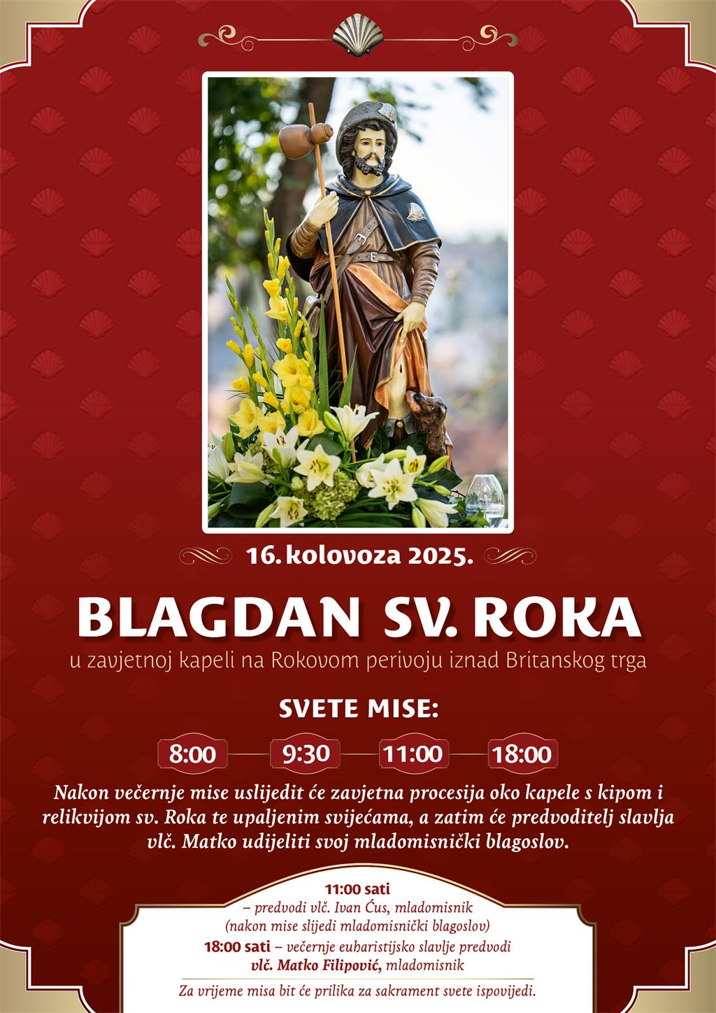 Nakon večernje mise uslijedit će zavjetna procesija oko kapele s kipom sv. Roka te upaljenim svijećama, a zatim će predvoditelj slavlja vlč. Filipović udijeliti svoj mladomisnički blagoslov.