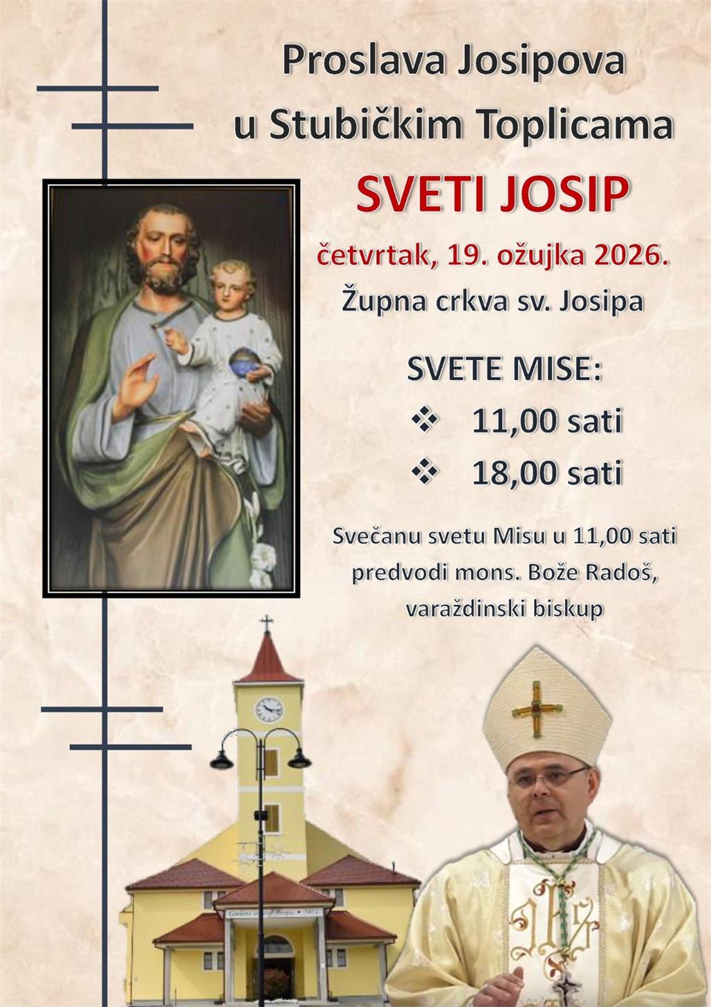 Župa sv. Josipa u Stubičkim Toplicama proslavit će svetkovinu svetoga Josipa u četvrtak 19. ožujka misnim slavljima u 11 i 18 sati. Svečano misno slavlje u 11 sati predvodi varaždinski biskup mons. Bože Radoš.