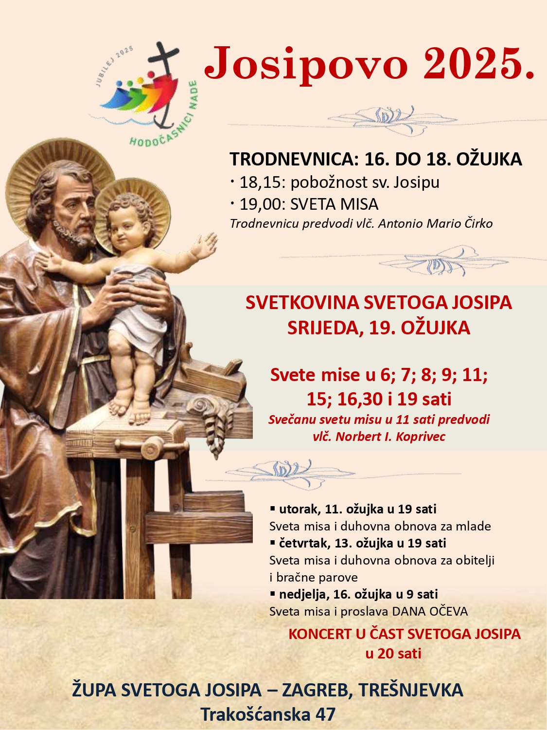 Župa sv. Josipa na zagrebačkoj Trešnjevki svog župnog zaštitnika proslavit će u srijedu 19. ožujka misnim slavljima u 6, 7, 8, 9, 11, 15, 16.30 i 19 sati. Svečano misno slavlje u 11 sati predvodit će preč. Norbert Ivan Koprivec, velikogoričko-odranski dekan i župnik Župe Navještenja BDM u Velikoj Gorici.