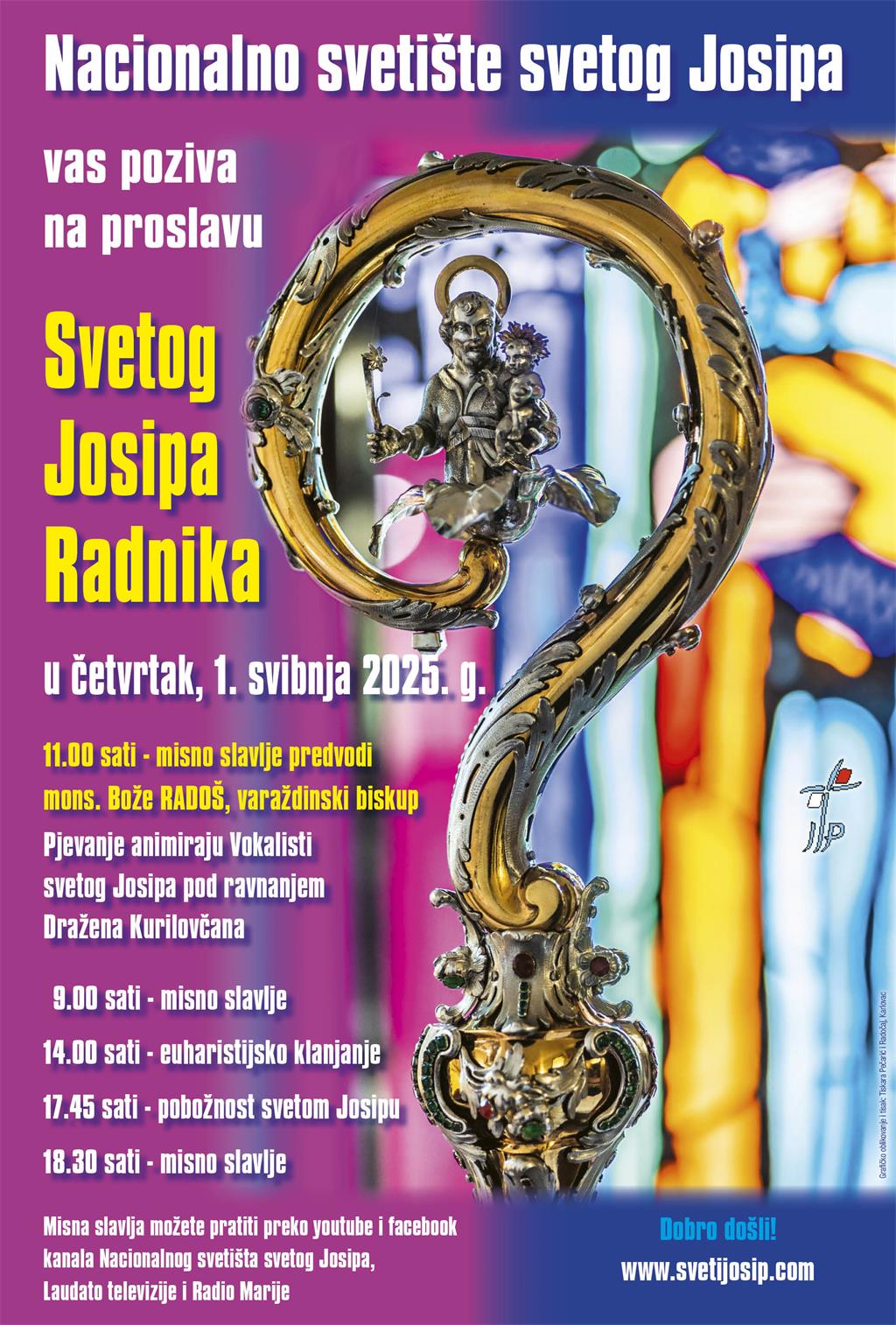 Nacionalno svetište sv. Josipa u Karlovcu poziva na proslavu svetog Josipa Radnika u četvrtak 1. svibnja 2025. godine. Središnje misno slavlje u 11 sati predvodi mons. Bože Radoš, varaždinski biskup. Pjevanje animiraju Vokalisti svetog Josipa pod ravnanjem Dražena Kurilovčana.