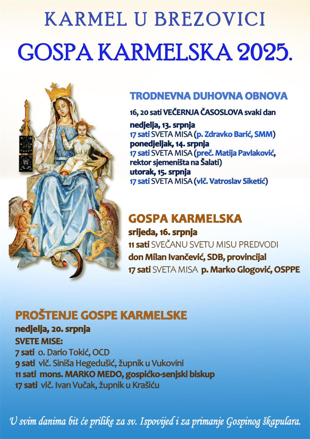 Svetkovina Gospe Karmelske svečano će se proslaviti i u srijedu 16. srpnja u Karmelu u Brezovici. Misno slavlje u 11 sati predvodit će don Milan Ivančević. Svetkovini će prethoditi trodnevna duhovna priprava.