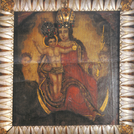 Iznad slike nalazi se Marijin pozlaćeni monogram, a Majka Božja sjedi na kraljevskom prijestolju. Desnom rukom obgrlila je maloga Isusa, a u lijevoj ruci drži kraljevsko žezlo.