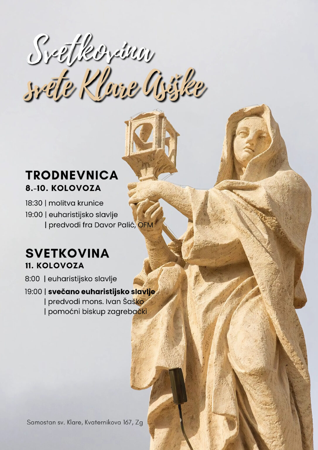 Središnja proslava blagdana sv. Klare u samostanu sv. Klare u Zagrebu održat će se 11. kolovoza s početkom u 19 sati. Misno slavlje će predvoditi pomoćni zagrebački biskup Ivan Šaško.