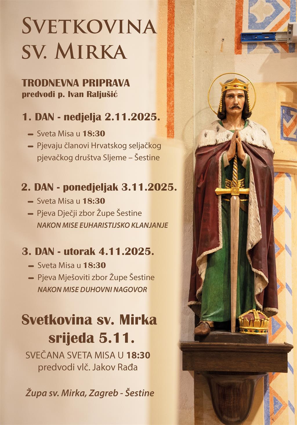 Župa sv. Mirka u zagrebačkim Šestinama proslavit će svog župnog zaštitnika u srijedu 5. studenog svečanim misnim slavljem u 18.30 sati koje predvodi vlč. Jakov Rađa, profesor na KBF-u i povjerenik za pastoral duhovnih zvanja i promotor kršćanskih poziva.