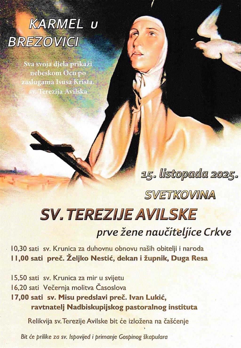 Svetkovina sv. Terezije Avilske, prve naučiteljice Crkve, bit će proslavljena u srijedu 15. listopada u Karmelu u Brezovici. Krunica za duhovnu obnovu naših obitelji i naroda molit će se u 10.30. Misu u 11 sati slavit će župnik u Dugoj Resi preč. Željko Nestić.