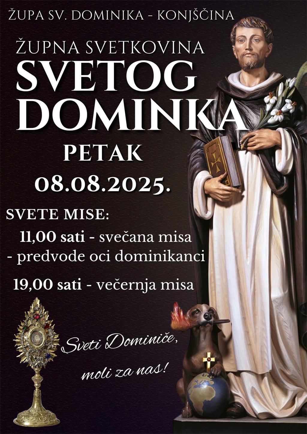 Vjernicima će na štovanje biti izložen relikvijar svetog Dominika, a pola sata prije svake svete mise bit će molitva svete krunice, litanije svetom Dominiku te prilika za svetu ispovijed.
