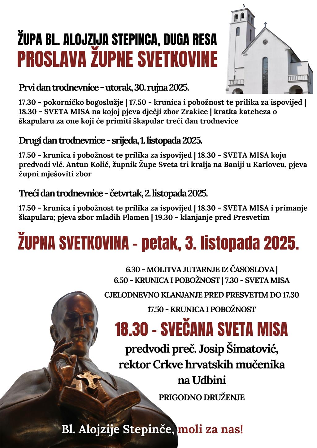 Župa bl. Alojzija Stepinca u Dugoj Resi svoju župnu svetkovinu proslavit će u petak 3. listopada, na 27. obljetnicu proglašenja kardinala Alojzija Stepinca blaženim. Svečano misno slavlje u 18.30 sati predvodit će preč. Josip Šimatović, rektor Crkve hrvatskih mučenika na Udbini.