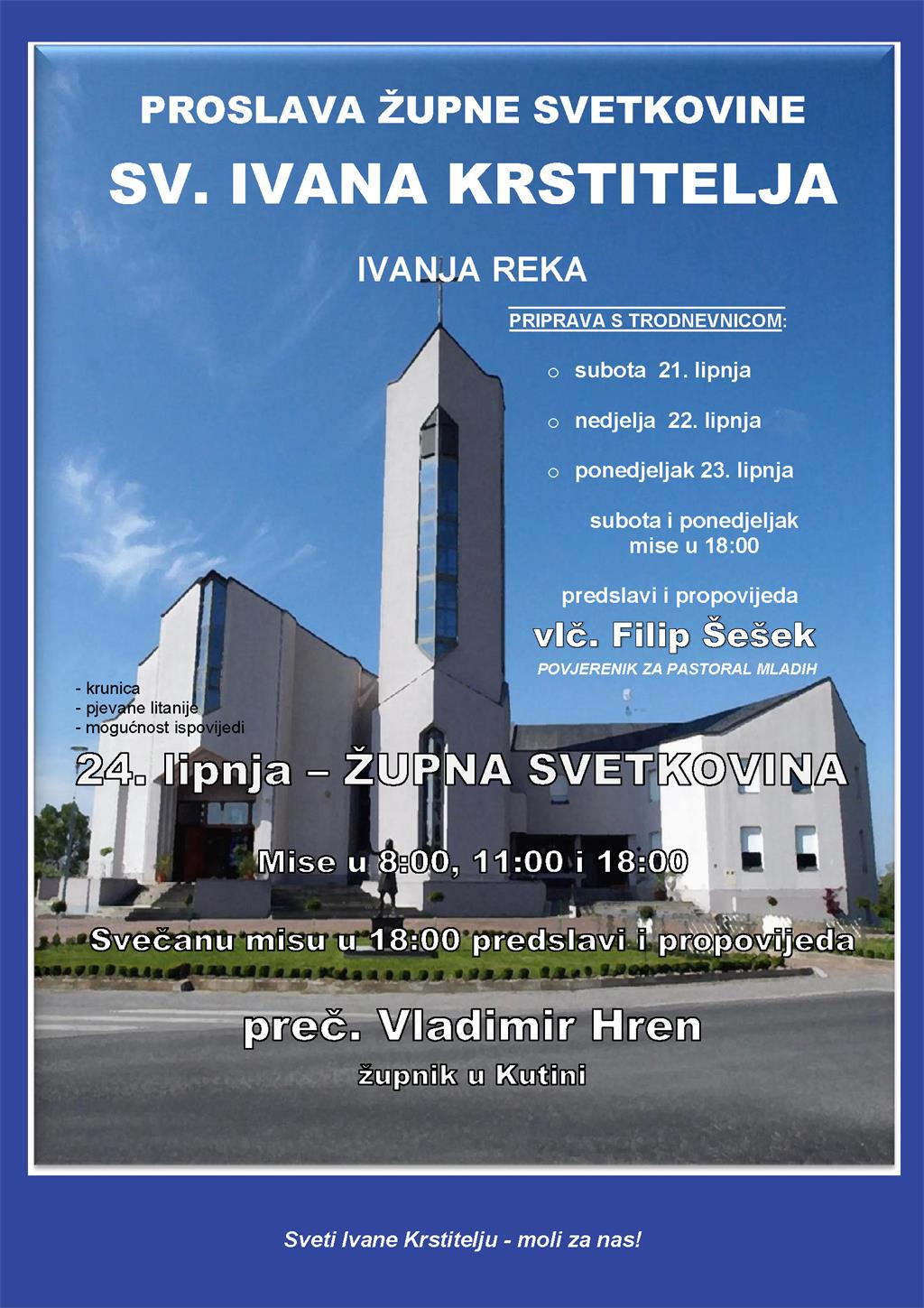 Župa sv. Ivana Krstitelja u Ivanjoj Reki svoju župnu svetkovinu proslavit će u utorak 24. lipnja misnim slavljima u 8, 11 i 18 sati. Svečano misno slavlje u 18 sati predvodi preč. Vladimir Hren, župnik u Kutini.